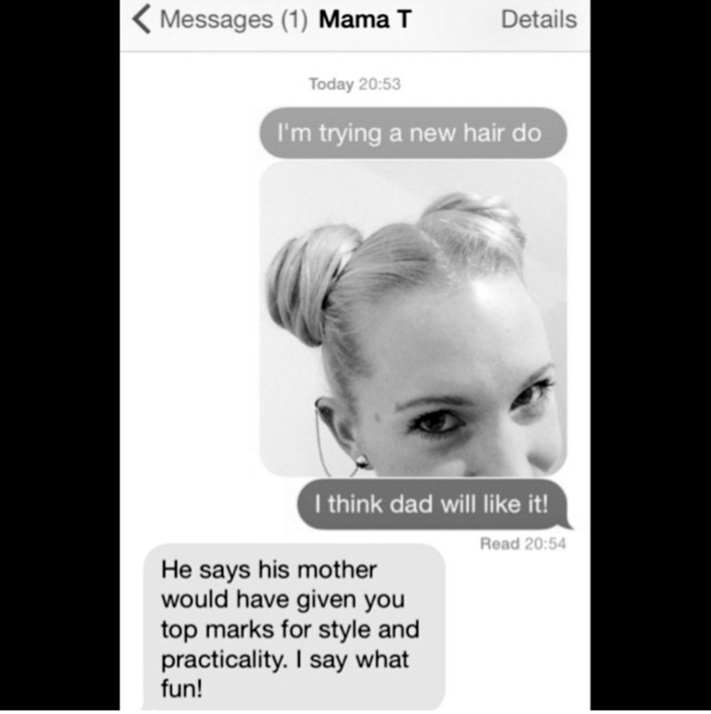 Five days before he died I sent mum a photo “I’m trying a new hair do, I think dad will like it!” to which she replied “He says his mother would have given you top marks for style and practicality, I say what fun!”.